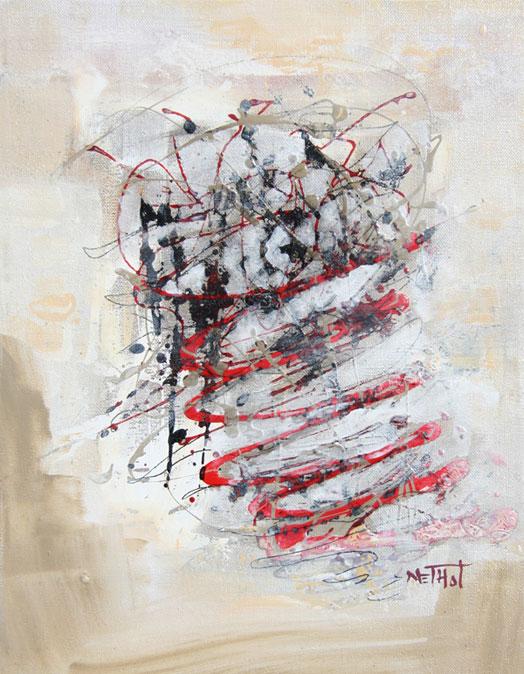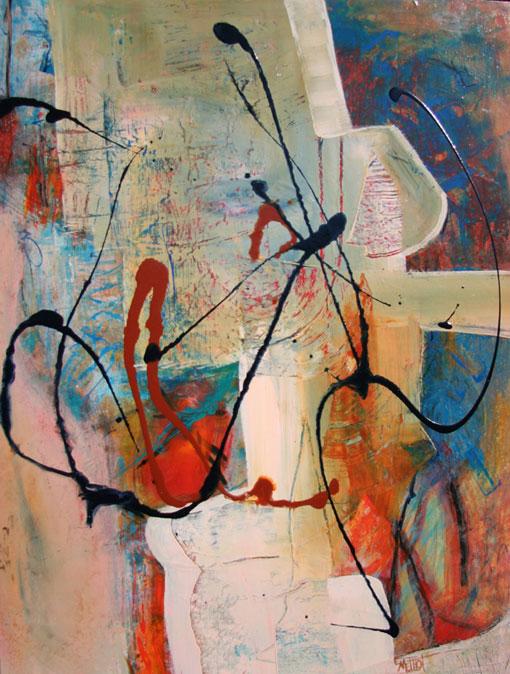 En 2005, ma participation à un atelier de techniques mixtes me ramène à la gestuelle et à l’énergie de ma pratique théâtrale. Ce passage vers l’abstraction revêt un caractère spirituel, voire libérateur : Travailler debout avec des feuilles de papier d’aquarelle de grand format, de l’acrylique liquide, de l’encre, du pastel, des crayons, des feutres, des tissus et des étampes, sur une grande table surélevée. À partir de ce moment-là, le fait de créer des textures et d’obtenir des couleurs intenses m’exaltent.